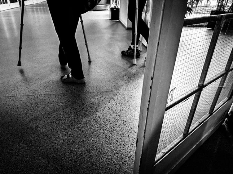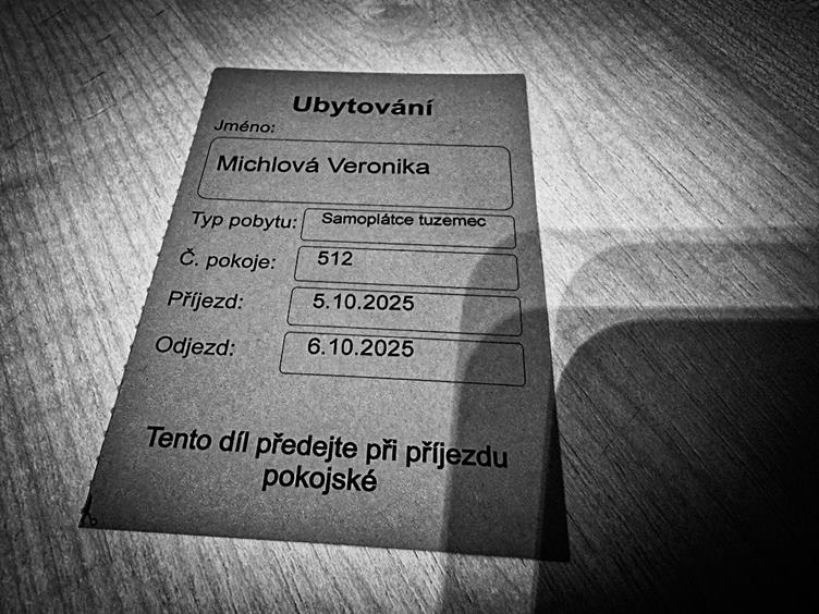 Detaily na mém pokoji, koukám kolem sebe, protože nemůžu spát. Na ranní kávě na recepci. Je sychravo. Krabíci (lidé o berlích jsou všude kolem nás). Moje jednodenní ubytovací kartička. A jdu na večeři, kde si už objednávám stravu na další dny. Franta tu je taky.