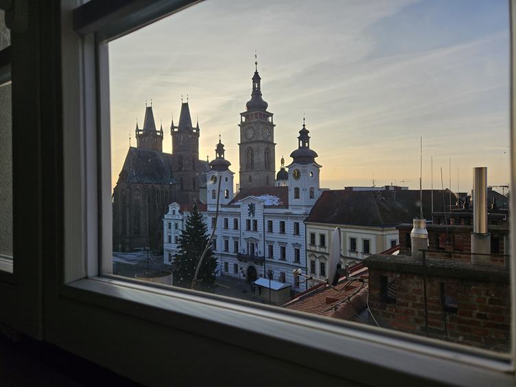 Pátek 28.11.2025 Dlouho očekávaný víkend s maminkami z Willíka. My tři jedeme autem, takže první zastávka v Pardubicích. Výtečný oběd v Galerie Café, mrknout na náměstí a zámek. Pak přesun do Hradce, našla jsem parádní ubytování na Velkém náměstí. Výhled se fakt povedl. Večeře v Šatlavě.