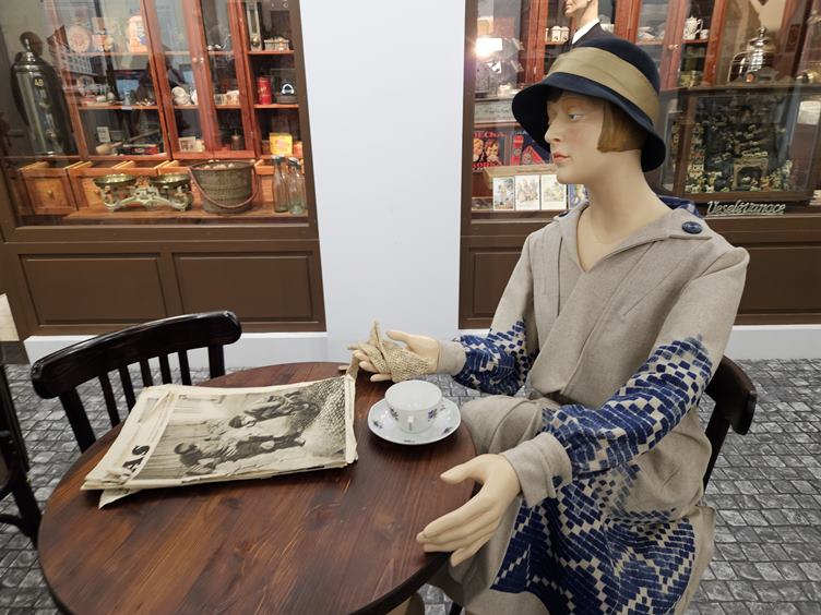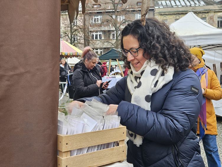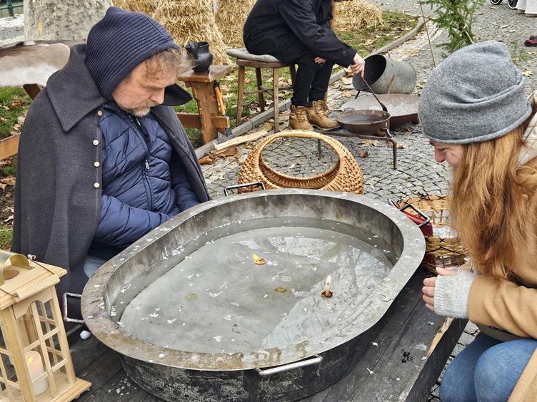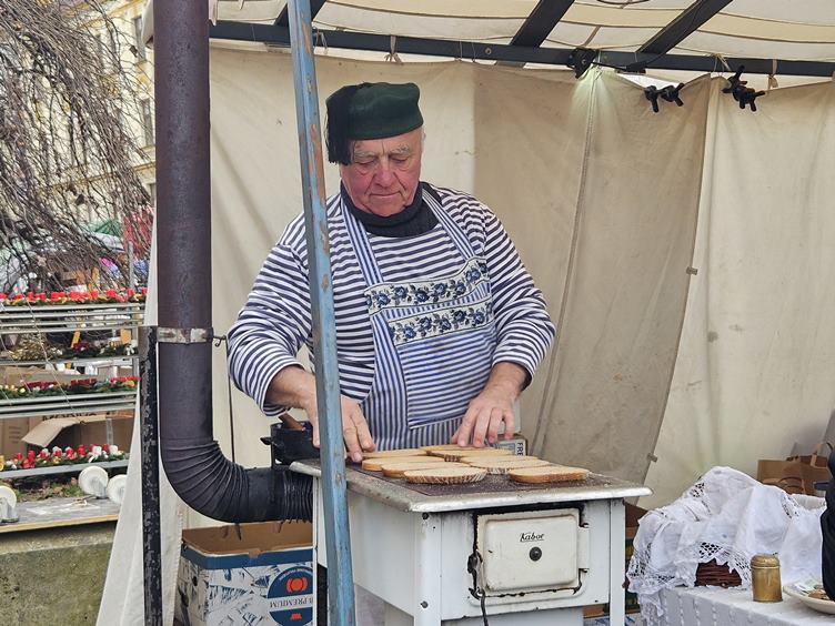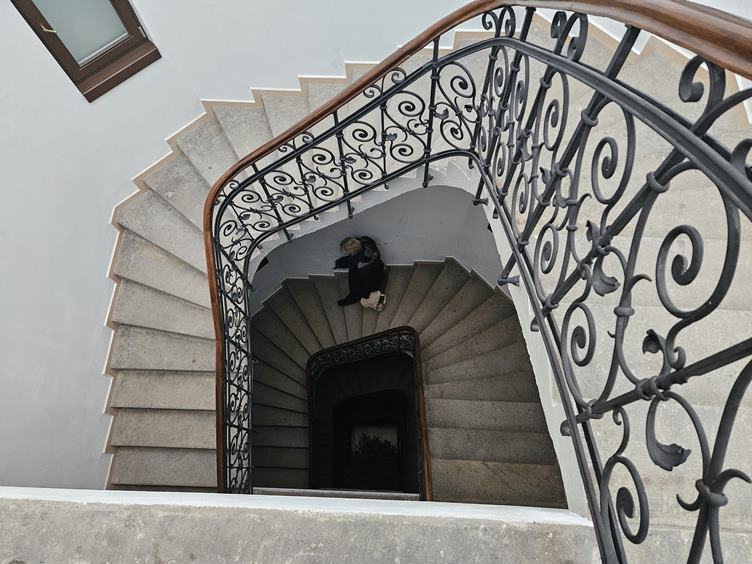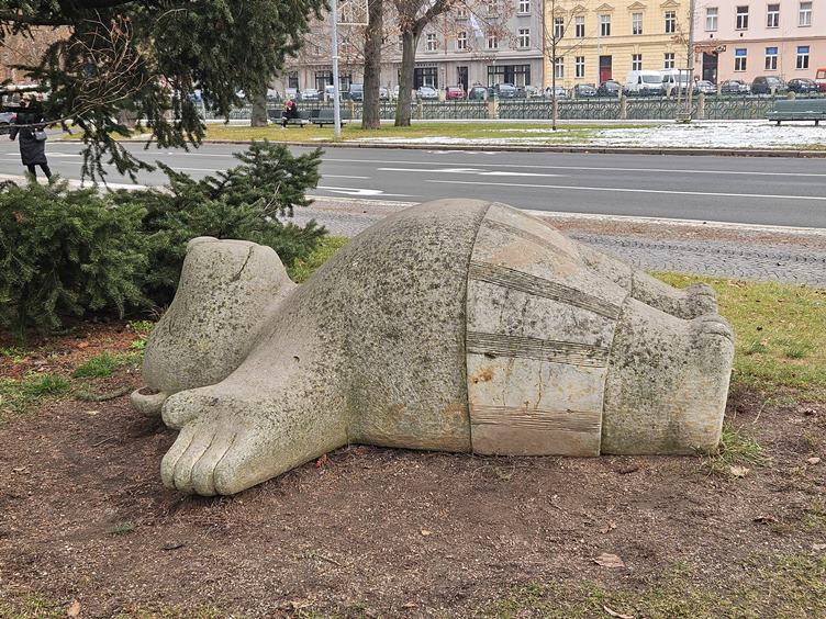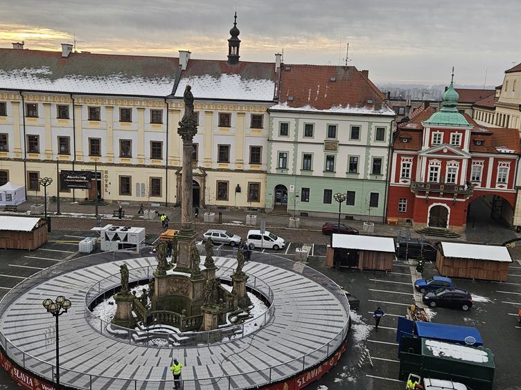 Sobota 29.11.2025 Na náměstí se připravuje kluziště. Schodiště v domě. Odpočívající medvěd, socha od Peruánce Aldo Shimora. Na parádních řemeslných adventních trzích u Muzea. Výtečný oběd ve vietnamské restauraci EMOI, doporučuju. Komentovaná prohlídka výstavy Salon republiky v Muzeu. Večer Klicperovo divadlo, Prašina 2.