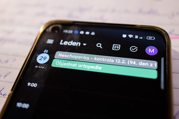 Je tam pro mě nebezpečno. Tím pádem nejdu ven a provizorně trénuji schody doma. Dělám si poznámky na hovor s doktorkou. Sundala jsem obvaz a podle barvy dlaně, se ze mě asi stává Šmoulinka. Mrknu, jak si vedou kytky na balkoně. S doktorkou se domlouváme na dalším postupu. Najím se. Dnes další cviky nezvládnu. Kakao ale dám.