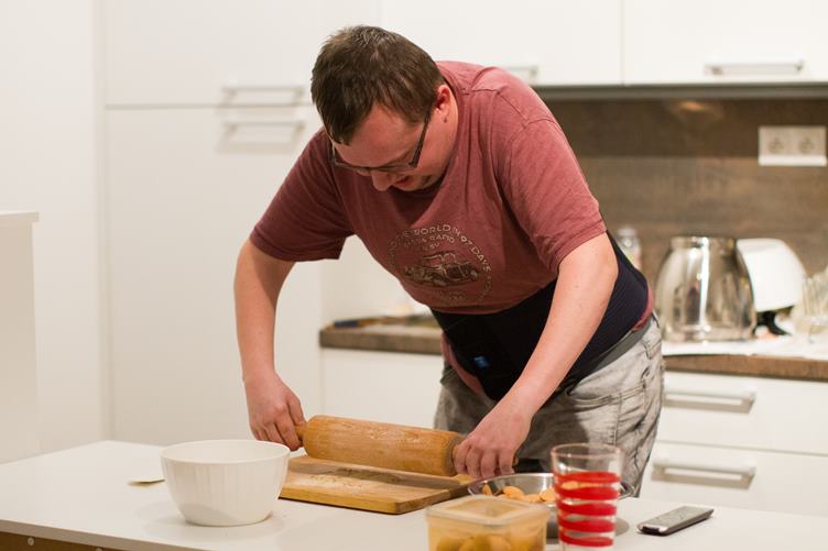 Přijela jsem domů až dnes a před spaním vybaluji dárky. Ráno mě čeká pořádný úklid bytu. Pouštím si k tomu vzpomínku na Vánoce z mého dětství. Dělám kakaové linecké a při tom vítám Míšu. Přišel si popovídat a přinesl večeři. Při povídání se pouštím do přípravy na vosí hnízda. Míša mi chce pomoct, a tak statečně bojuje se starou známou ženskou zbraní - válečkem :-D