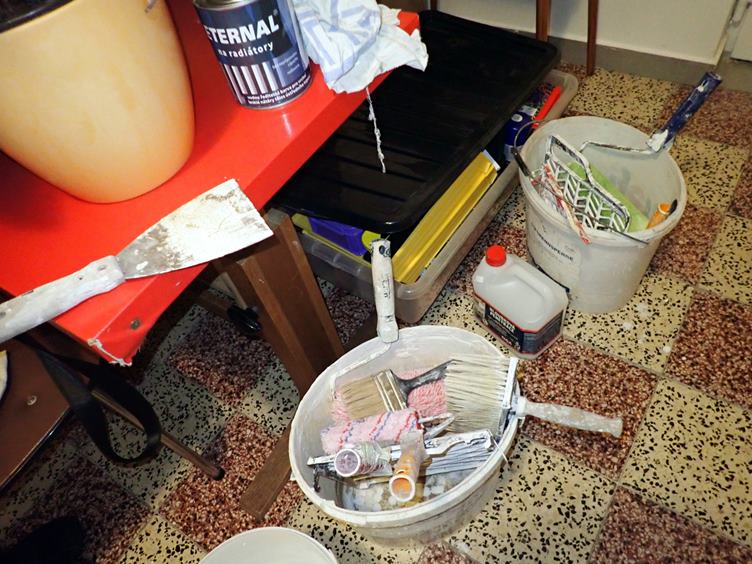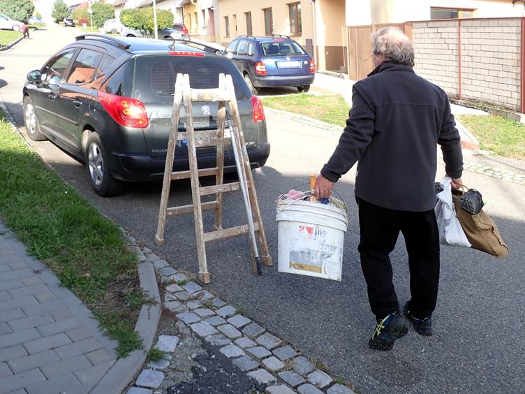Brzy ráno pro pečivo z agropekárny... Dnes při malování na programu žlutá... Opět zlatohlávek na dlžě... Rosťa domaloval a odjel... Odpoledne v Arše s Oldou a Laďou...