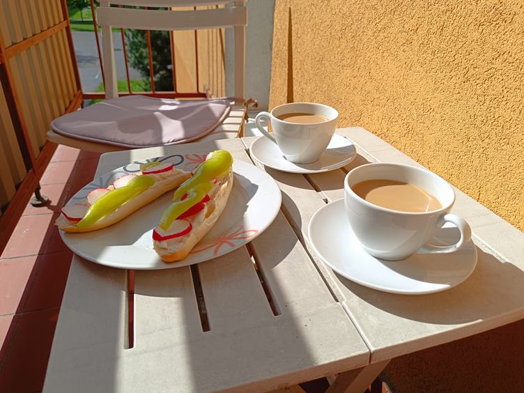 Ľudka si dala raňajky na balkóne. Večer som menil Dominikovi hroty na tretrách a vykladal zaváraniny od našich do špajze.