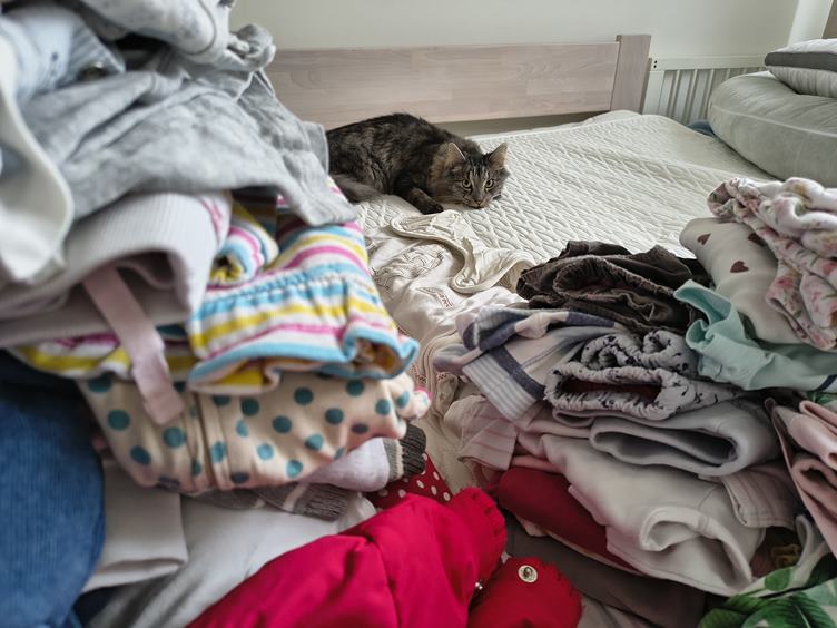 Státní svátek. Třídím tašky dětského oblečení, co jsme podědili po kamarádech. Muž ze sebe dělá člověka a vyrážíme trapně do obchoďáku, protože potřebujeme pár věcí posehnat (a už fakt nevíme dne ani hodiny, kdy se malá rozhodne vykulit na svět, takže co můžeme, řešíme radši hned) - při té příležitosti kupujeme novou deskovku. Pak se jdeme ještě projít a zastavit pro balíček. Následně zaujímám standardní pozici na gauči... a peru jednu z mnoha várek těch mimi oblečků.