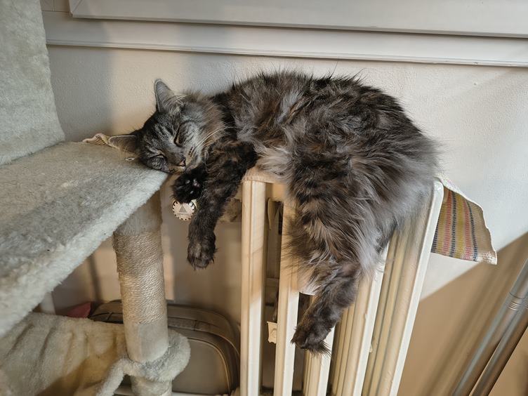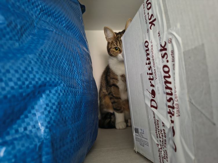 Další fotograficky nezajímavý den strávený doma, navíc jsem špatně vyspalá kvůli rýmě. Trochu uklízím (což se nelíbí kočičkám), potom přišla na poslední předporodní návštěvu naše porodní asistentka. Zlobivá kočka Minerva zase leze, kam nemá - tady "není vidět" nahoře na skříni. Přišel mi balíček s přízemi, teď už bych měla mít dost na dodělání toho svetru. A večer zavařuju další přesnídávky pro prťouse.