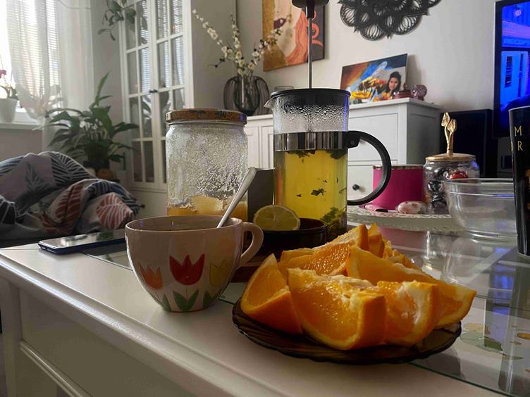 Ráno sa Rasťovi prejaví prechladnutie, pobozkala ho nejaká virózka, tak ja idem nakúpiť nejaké vitamíny * príjemná prechádzka - z obchodu zasa domov * cestou sa teším zo snehu * doma varím obed a čaj a robím ovocné občerstvenie * poobede sa priostruje, musím ísť kúpiť sirupy a nejaké paraleny ... * Aliya už stráži chorého dedeho * neskôr vybehne teplota aj jej * dávame sirupky * a obklady - a zajtrajší odchod na dovolenku prekladáme :(((...