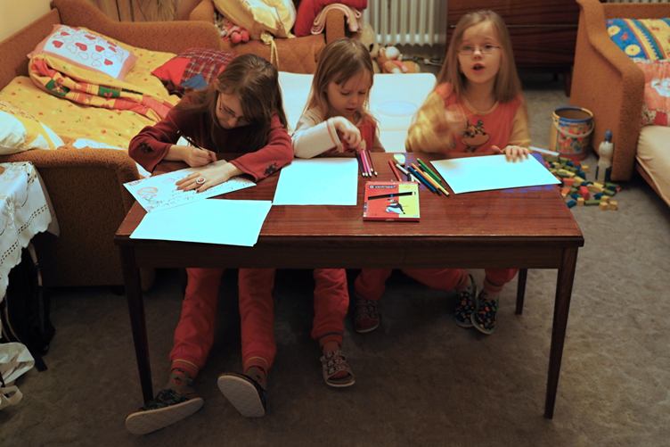 Sobotní ráno všechna moje děvčata začala společným čištěním zubů a po snídani jsme vyrazili do města na nákup pyžam a papučí pro holky, aby si k nám nemuseli pořád vozit svoje z domu. Po obědě jsem se s holkama šli podívat na generální zkoušku Pavly a jejich kolegyň břišních tanečnic na jejich páteční vystoupení. Když to holky přestalo bavit, zašli jsme do kroměřížského muzea, kde byla výstava historie ložnic s krásným dětským koutkem. Prošli jsme se i ostatními expozicemi a skončili v kavárně, kde si holky daly horkou čokoládu. Doma jsme povečeřeli a holky si pak malovali a vyrobily nám nádherná přáníčka. Před spaním jsme se ještě podívali všichni společně na pohádku.