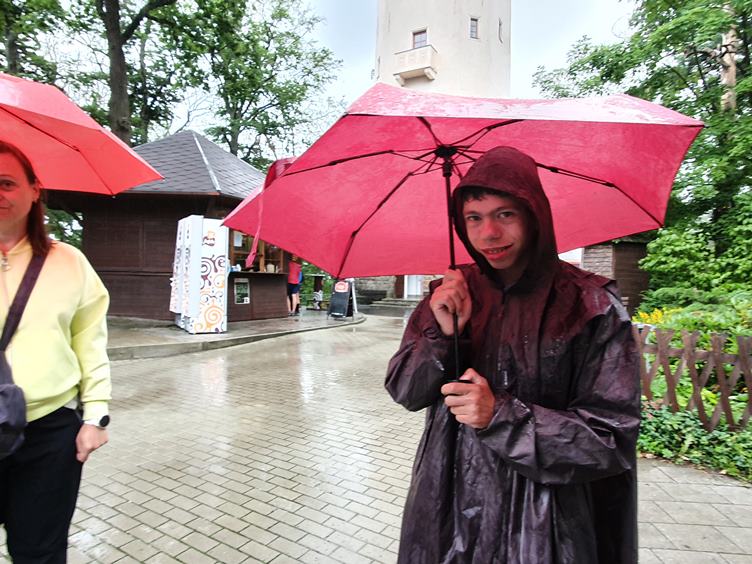 Pátek 9.7.2021. Předpověď počasí je tristní. Jedeme ke kamarádce do Varů. Společný výlet od Linharta na Dianu. Vede na ni výtah, Bart jede 3x. Ale zmokli jsme opravdu hodně...