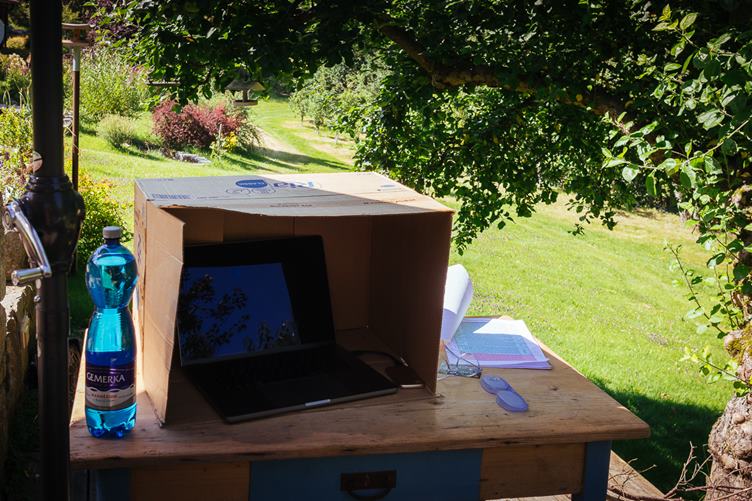 Trvalkový záhon v plném květu, na horní louce včera sebrali seno. V noci jsem spala venku, letos je sice horké léto, ale noci jsou celkem chladné. Zahradní kancelář, sklizeň a odpolední plavání. Večerní hry s Archiem a při noční práci na počítači asistuje kobylka.
