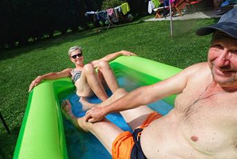 (1) Ráno si přečtu, co o nás píše místní plátek :-) (2) Snídaně (3) Jedu na nákup (4) Jsme sami, zbytek odjel na kolech (5-6) Bazén je jen pro nás :-) (7-8) Opět jsem griloval (9) Poslední večer, my chlapi koukáme venku na MS v atletice