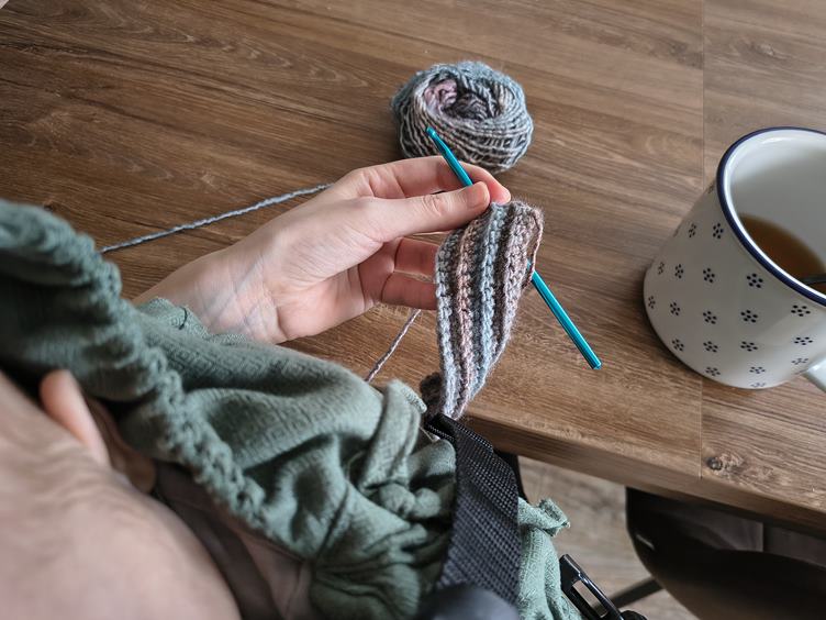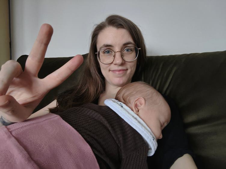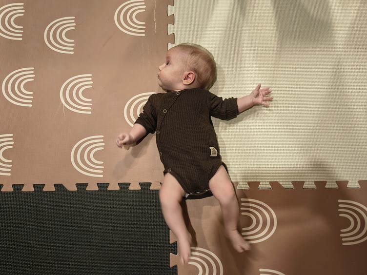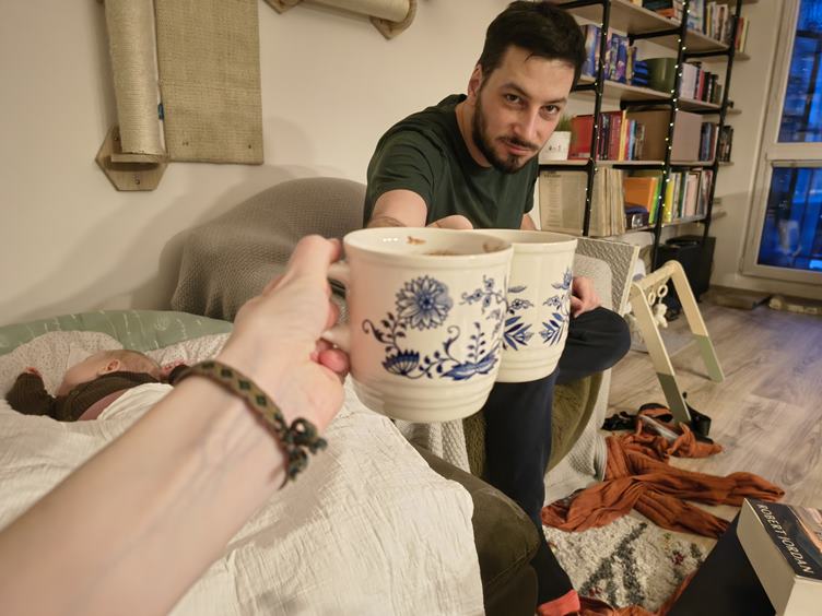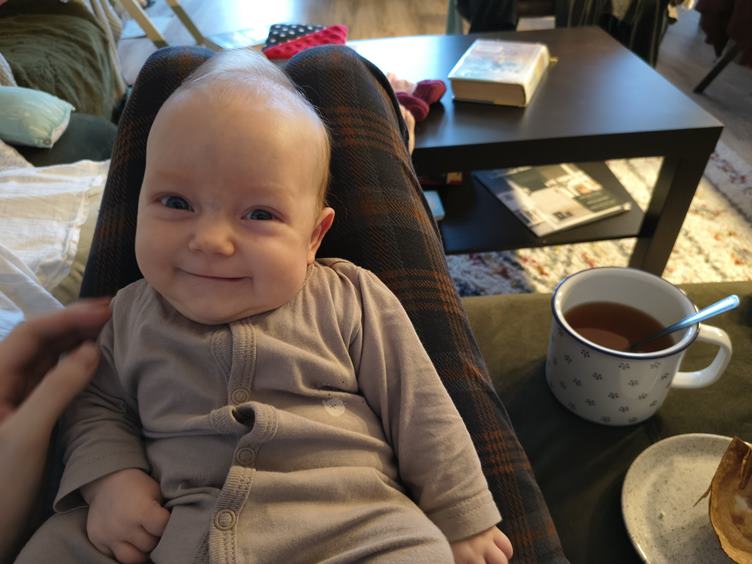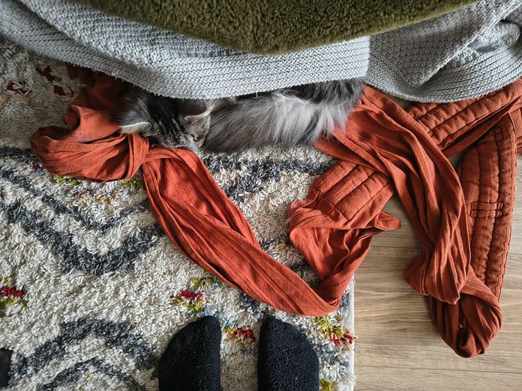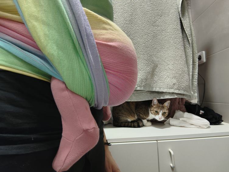 Ráno máme vysmáté dítě a tentokrát si i dosáhnu na snídani, což je taková malá výhra. Když pak mrňavka usnula - jak jinak než v nosidle - myju nějaké nádobí, co nejde do myčky, a zvládám i trochu háčkovat. Kočky řádí, všechno rozhrabaly, a pak z toho mají nový pelíšek. Další malá výhra - Johanka usnula bez nosítka, takže tentokrát nemusím laborovat, jak ji z něj dostat a neprobudit. Pak jedeme k té paní doktorce, až na řev cestou zpátky jsme to zvládly skvěle. Dorazil nám z práce tatínek a nad vyřízeným spícím miminkem si spolu dáváme horkou čekuládu. Pak trochu cvičení v "gymu" a nakonec trénujeme uspávání v šátku.