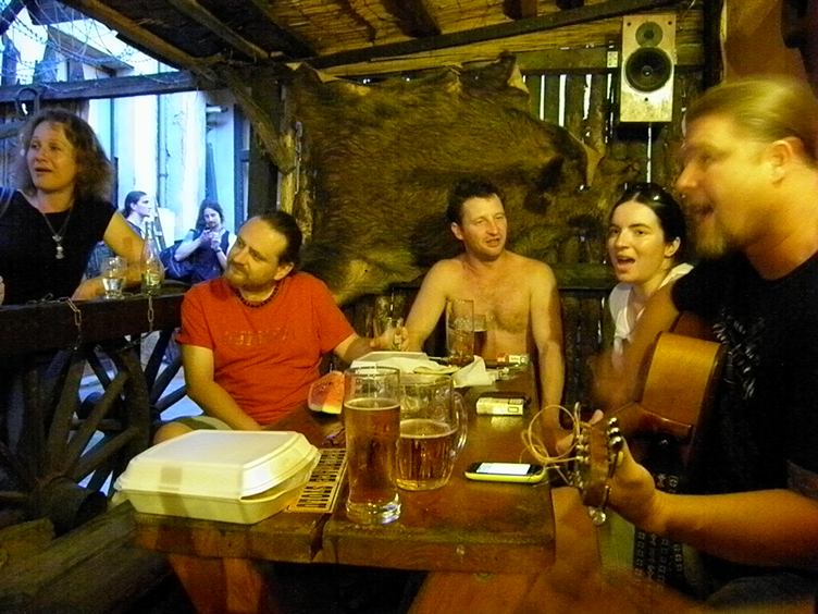 1 - venku 36°C a my máme 10° ve stínu 2 - a taky máme nejlepšího hostinskýho, který se o nás nadstandardně stará :-D 3 - jo, ta technika, láká malý i velký kluky 4 - disciplinovaný Denny pes leží vedle grilu a ani neloudí, asi ho taky zdrtilo horko 5 - tak tedy vše nej k narozeninám a mejdan (6 - 9) může začít. dort, který prý měl čtrnáct kilo, pekl taky hostinský. a nálada byla báječná...