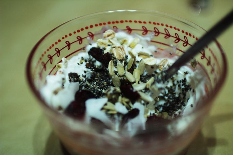 moje milovaná snídaně, ovesná kaše s kokosem, slunečnicovými semínky, sojovým mlékem a tak dále :) <3 || tohle je školní knihovna a zároveň podle mě nejhezčí kabinet na škole, češtinářský, s nábytkem přes sto let starým. || a také tu místnost zdobí stará tabla || vážně žlutej? || musím si koupit nové štětce || asi se budu stravovat pouze tvarohem a semínky, I love it :D <3 || skvělá hudba! || Osmá fotografie znázorňuje mého osobního trenéra Simíra Gerchána, který mě dneska v posilce zničil :D:D || Chia semínkaaaa!:D