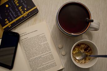 1 - moje normální ráno - čaj, vločky, vitamíny a knížka.
