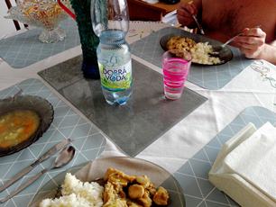 1- ospalé ráno... 2- zátiší se stužkou... 3- brousím nože... 4- krájím cibuli... 5- promíchat cibuli s kuřecími nudličkami a nechat chvíli odležet... 6- obědváme... 7- dostala jsem od Władka kafe... 8- pracovní koutek... 9- a večer v télce premiérové Zázraky přírody...