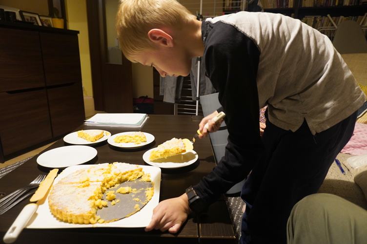 Po práci som vyzdvihol Samka na atletike. Ľudka upiekla koláč. Samko nakreslil v škole strom s hríbami.