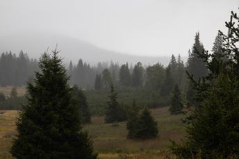 Původní časový harmonogram padá - pořádně leje. Vyrážím tedy později, když prší méně. Vypadá to, že Modrava je kdesi v pekle. Jdu podél vydry až na Březník. Mlha přede mnou, mlha za mnou, ale je tu krásně a díky počasí s minimem lidí. Pokračuji na Cikánskou slať a zpět do Modravy.