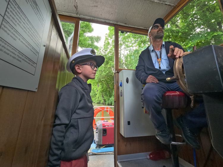 Konečně volný víkend! Naložit kola, kufry, nás a jedem. Autem směr Baťův kanál. Po ubytování v Rohatci jedeme vlakem proti proudu do Veselí nad Moravou. Posilnění obědem nasedáme na kola a hurá na cestu. Asi v půli cesty máme Strážnici a vyhlídkou plavbou lodí. Maxík měl půjčenou kapitánskou čepici a mohl i na kapitálský můstek. Druhá půlka, jak už to bývá, je trochu náročnější. Po návratu zajedeme do Hodonína na zeslouženou večeři. "Tati kdy už nám to přinesou?" V penzionu je i vinný sklípek, kde má každý pokoj svoji kóji, ze které se můžou hosté sami obsloužit. Velice sympatické řešení :-)