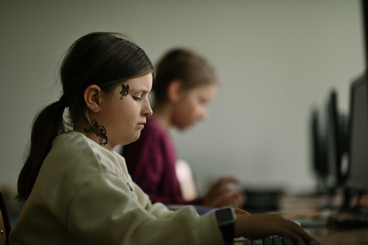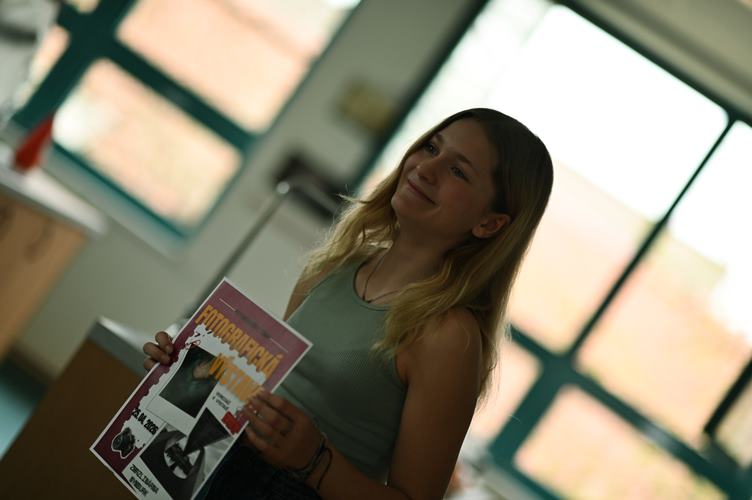 Napadl mě test s popisem kostí na kostře ... Michelle zve na výstavu ... Holky pracují na projektu ... Michelle mě pozoruje ... Připravují projekt s překvapením ... Čtvrťáci pracují na počítači ... John si přišel pro dceru ... Čekám na rodičák a lítám nad skateparkem ... Po rodičáku fotím stínky.