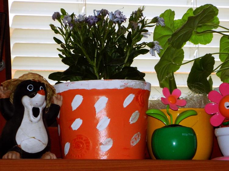 taťka šmoula na na nás dohlíží opět vytahuje dávno zapomenuté hračky,fialka mě teď těší krásně kvete,a u Sáby na okně kytky hlídá krtek a na zahradě bych ho nerada už viděla!!!,u sousedů na zahradě mají nové ovce a dnes pořád mečí,srdíčko z granka na pudinku:-),blbinky Sába objevila rozbitý zrcadlo a já sem se hned viděla takto:-))),krása na fasádě jojo jaro a vlaštovičky ,pěkná pavučinka před stodolou,chtěla sem vyfotit skálu a dostal se mi tam sloup!