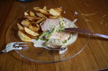 Vstávám. Po příchodu do práce. První stůl - čtrnáct cyklistů. Losos na hřibech - oběd od šéfa, který měl křtiny nejmladší dcerušky. Točím. Děda s babčou se za mnou stavili na pivo. Přerazit sud. Orosená odměna. A opět židle "na ježka" = končíme.