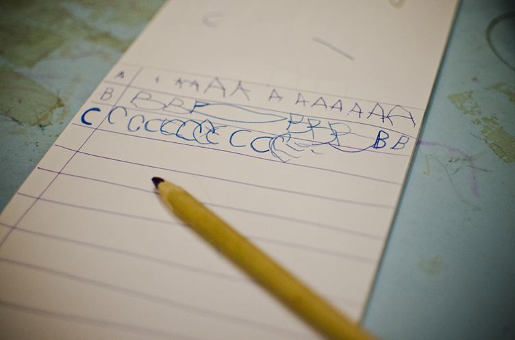 Ráno je nějaké rozmazané a bolavé :) Přijel na otočku děda, ale já bych šla radši spát. Bobík se učí psát:)