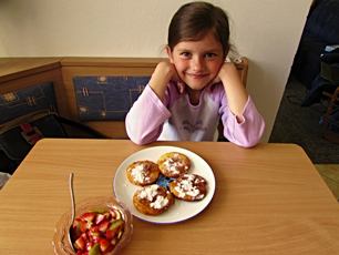 Olča dělá ovocný salát, pak dělají s Andy úkoly, na lednici.., u okna, k obědu máme lívanečky s ovocným salátem, odpoledne vykopávám pařezy, trochu fotím a pak si dám za odměnu pivíčko :-)