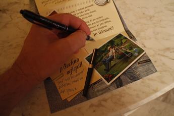 (3) Není to poprvé. Je špička a tramvaje do Poruby musí jet oklikou přes Vítkovice (5) Jeden podpis pro oslavence (7) Hela koupila kalendář (8) Oslavenec došel jan na skok