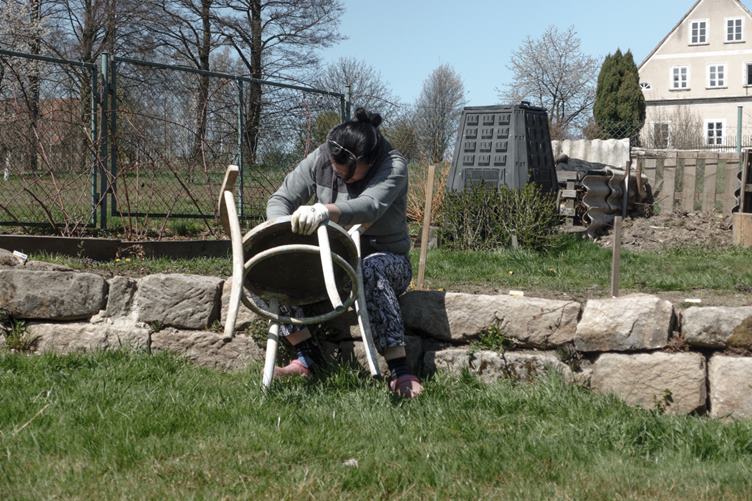 Ráno si připravím pracovní pomůcky, pak si na tu šichtu protáhnu tělo. Venku je zase slunečno a sucho. Sojka si hraje s židlí a odpoledne se jdeme podívat ke Katce a Evženovi.