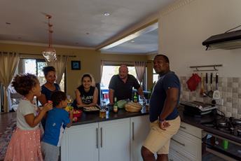 málo elektřiny a Bokang pořád vyhazuje sekačkou pojistky/ zob slepicím/ pohled/ Eli fotí/ krkovice, poprvé na pultě ve sparu, naložená/ jedeme se potkat s dalšími Čechy/ to však padá a zbyli pouze René s Jarkou a Elizabet, tak jsme je pozvali k nám/ René je taky z Třince a Jarka z Frýdlantu nad Ostravicí, moc milé setkání/ Mandas