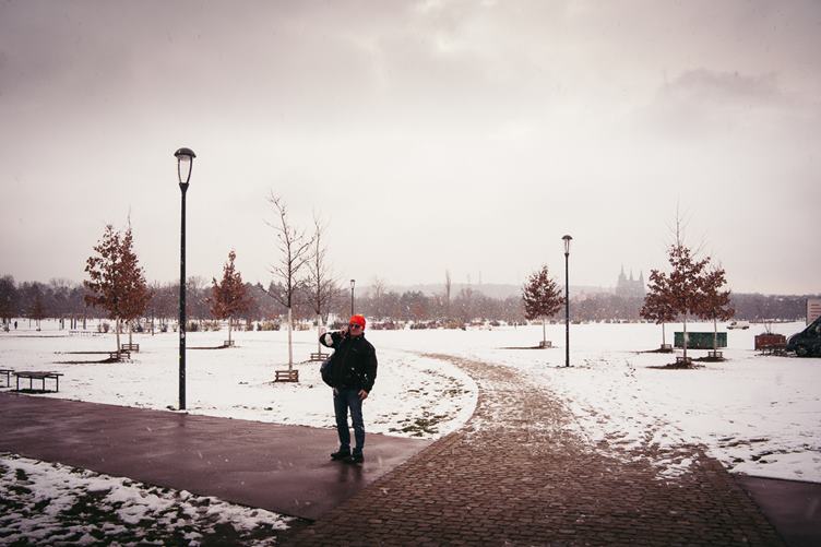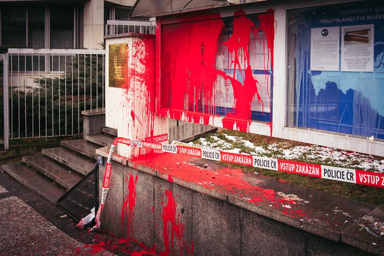 Ráno ještě v Krumlově, oběd již v Praze, výborná pekingská kachna. Na Letné se drží sníh, který ráno napadl. Nově natřený plot u Ruského velvyslanectví. Náhodou šel kolem pán s krvavou barvou... Výzdoba na plotě, no je to trefné. Večer rekvalifikační kurz a noční Prahou do bytu.