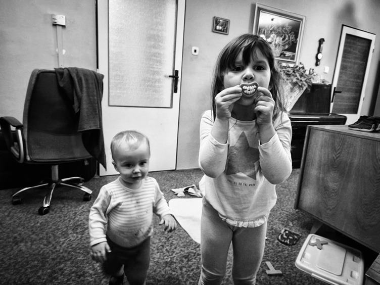 1. Ráno jsem byl u svého obvoďáka moc brzo, tak jsem ještě pokuřoval a fotil na náměstí před barákem 2. Před ordinací jsem potkal bývalého kolegu a kamaráda Ríšu 3. Doktor Rataj i čekárnu zvelebil 4. Po cestě od lékaře jsem zas narazil na svou bývalou posádku a trochu se povozil s Tomem 5. Ještě než jsem vyrazil domů, dal jsem si pořádné kafe 6. Tohle byl můj oběd: brkaše z odtučněného mléka s tuňákem 7. "Ne Filípku, fakt tě nemůžu pořád zvedat" 8. Chůvička babička 9. Anežka si z bruslení přinesla další barevné křivé zuby