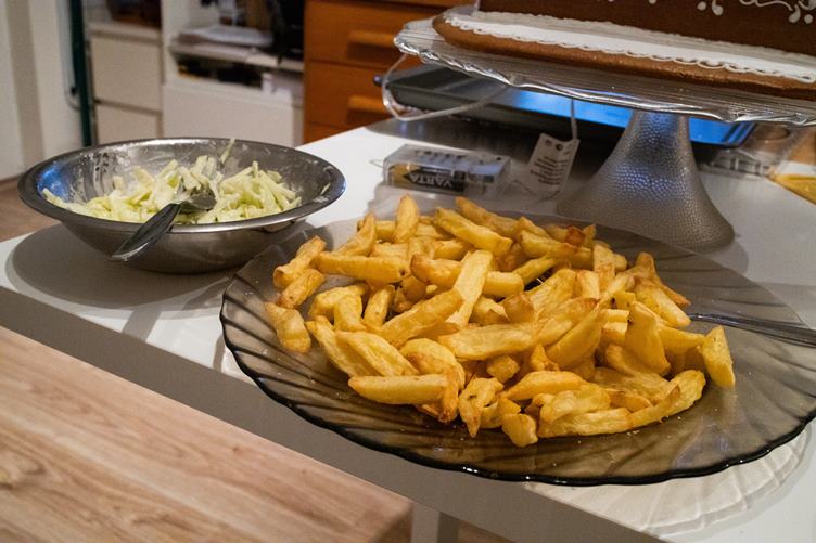 Najím se. Konečně nacházím sílu si zacvičit. Další stavební práce. Rychlovka k jídlu. Volá mi Míša. Umyji nádobí. Udělám další polevu a jde se do finále. Hotovo.