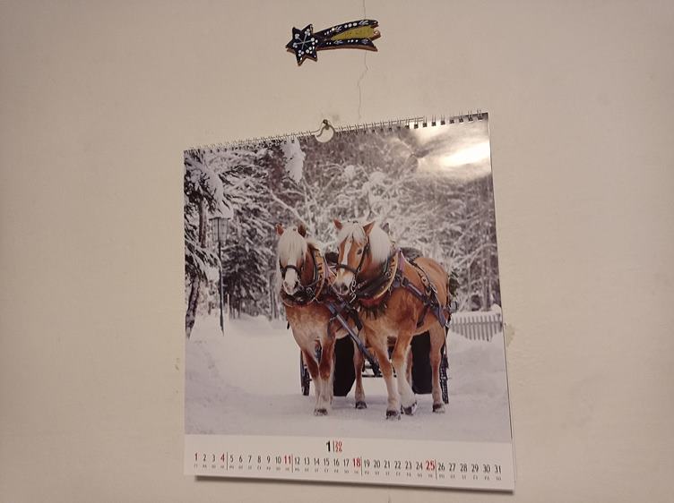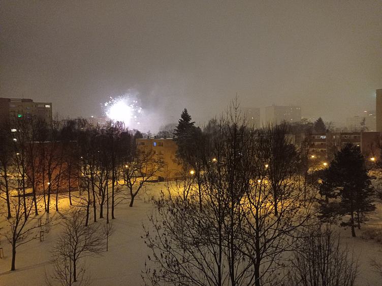 Nový rok 2026 začíná! Dopoledne. Oběd. Na kruhovém objezdu na Josefa Kotase se za vše připravuje k ohňostroji. Vracím se domů. Na zdi mám nový kalendář. Připravil jsem z pomocí ChatgpT obrázek pranostiky Na Nový rok o slepičí krok. Večer. Hrozně jsem přes svátky přibral.