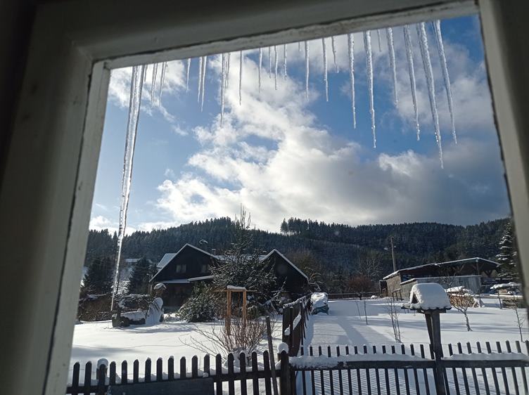 Jasná noc zanedlouho skončí. Ve vlaku do Beskyd. Cestou ze zastávky. V minulosti bývalo sněhu o hodně více. Na cestě lesem jsou jen stopy zvířecí. Moc dobrá polévka. Rodiče mají krásný kalendář. Dělají se rampouchy. Udělal jsem legrační jakoby bankovku. Na Facebook jsem dal do obrázku pro jistotu výrazné upozornění, že se nejedná o skutečnou bankovku, ale jen o humor :-)