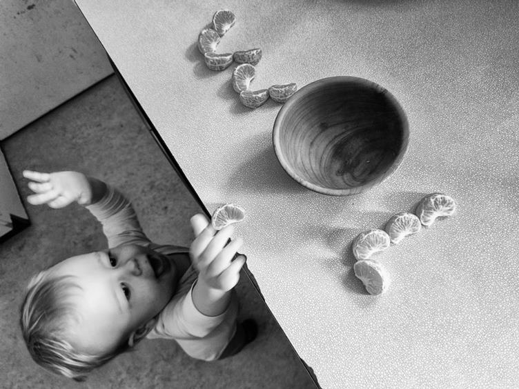 1. Fili musel ráno do ohrádky a tak nějak se začal oblékat sám 2. V dobách sněhu a jeho zbytků se ve školce musíme přezouvat na chodbě 3. Když jsem se vrátil domů, Filda už zase chrněl 4. Na sváču měl dneska mandarinky a já je pomalu nestíhal ani čistit 5. Prádlo na sušáku nemá od Filípka obvykle moc klidu 6. Radši jsem se s ním zavřel v obyváku a dělali jsme blbiny 7. Když jsme se vrátili do kuchyně, udělal si ze stolku výdejní pult 8. Anežka měla včera na bruslení nový termohrnek s brčkem a já ho dneska taky lehce otestoval 9. Fili byl po dnešním blbnutí tak utahaný, že usínal při večeři