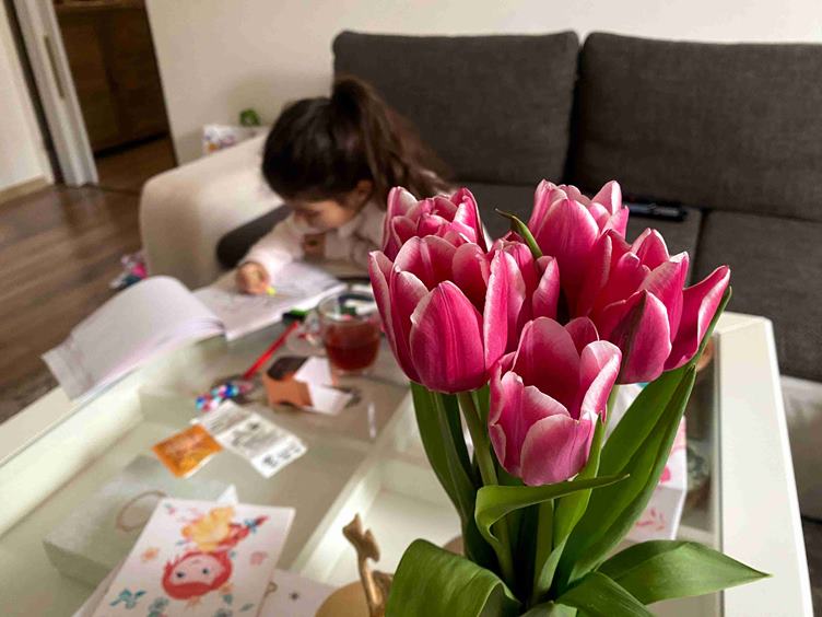 Šípková Ruženka * nechce sa jej vstávať (a to je dobre, aspoň vyleží virózku) * potom zasa nejaké maľovanie a riešenie hlavolamov * malý obed * aktivity * trocha upratať v kuchyni - pomocníčka * a keďže sme nevyrazili do hôr - ja cestujem na Sicíliu * tulipány sú stále krásne * robíme si movie night aj s popcornom