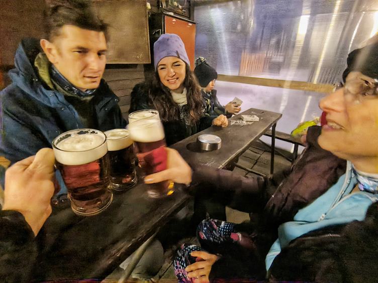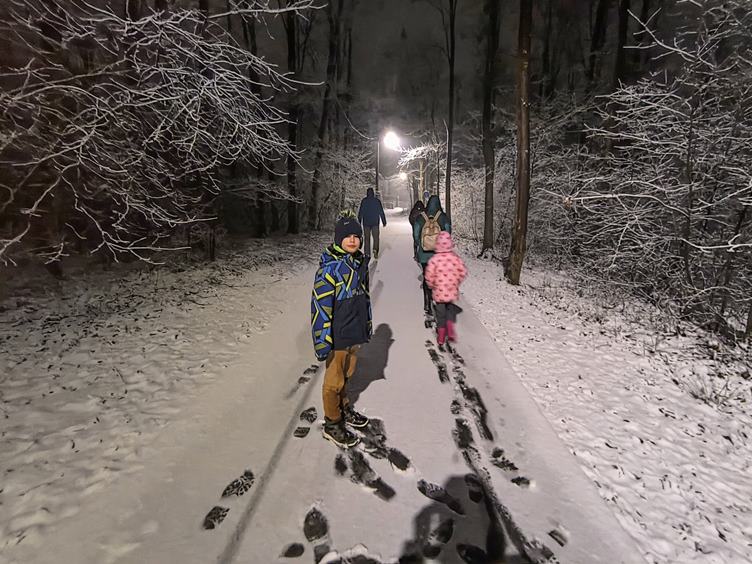 (1) Jedu nakoupit (2-4) Čekáme na Radima než přijede autobusem a můžeme popřát jemu i Robinkovi (5) Z louže do bláta i mlhy přes K2 do (6) Skalice café. Vzal jsem si šustku a mám ji celou mokrou (i nátělník) (7) Zpátky už po cestě, začíná sněžit (8) V klubu bylo plno tak si v kuřárně Kačabaru dáme jedno. Cítíme se jak někde na horách (9) Sněhu je zatím málo, ale o půlnoci ho je již patnáct cm.