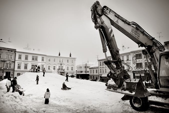 Ranní seance mé ženy Lenky se synem a moje kalorická snídaně desert Tiramisu. Stromeček je již venku a zbyla z něj obrovská hromada jehličí. A prý, že tento smrk neopadá. Sníh se využil na sněžný dům pro syna včetně psí boudy přímo před domem. V práci chodíme do školy pro děti a jedna momentka ze šatny. Vycházka k rotundě svaté Kateřiny. Radnice města Znojma měla skvělý nápad. Ze spousty sněhu postavit pomocí těžké techniky v centru na náměstí umělý konec na sáňkování.