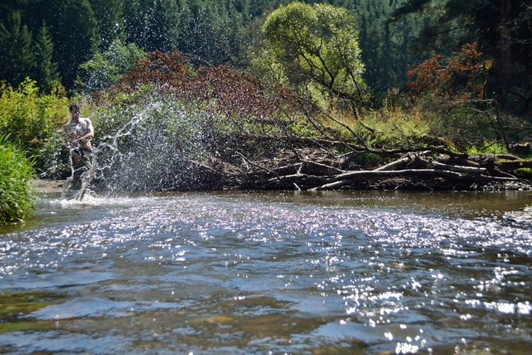Zase první kdo rozlepil oči,tak si můžu v klidu užít raní chvilku.Když je zataženo = obsazeno.Jako vrchní vodonoš doplnim chalupu a vyrážíme na další procházku.Dopo přijela Maruš a už je zase horko, tak se jdeme zchladit ke Kosáku.Jelikož se furt courám a něco fotim doháním zbytek poskoky.To nevydržela Maruš,řekla že jsem fakt debil :) a ať jí dám miminko,že mi to dokáže.(takže 4ka od Maruš).Pak už cachtačka a pohoda.Doma čekala maminčina bramboračka a byla luxusní.Na táboře je sbor ze Sušice,takže od pěti v kostele koncert,který narušovala první veřejná zkouška Kořen Boys.Místní chlapci s kytárkama v kombu (věkový průměr 60).Ze zámku taky mjůzik,od muzikantů na soustředění,takže 3 scény jako na Trutnově.No a večer zase zpívaná, píva a chlad.Šel jsem si do skříně pro něco teplého a zkusit jestli stihnu natáhnout kamaše i kalhoty než dojde samospoušť a ...ne :D Pak pokec s částí kapely ze zámku a pozvání na zítřejší koncert.Ten pes co mu Maruš háže míč,je jezevčík říznutej s vlčákem