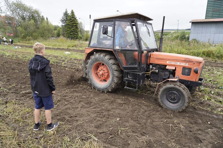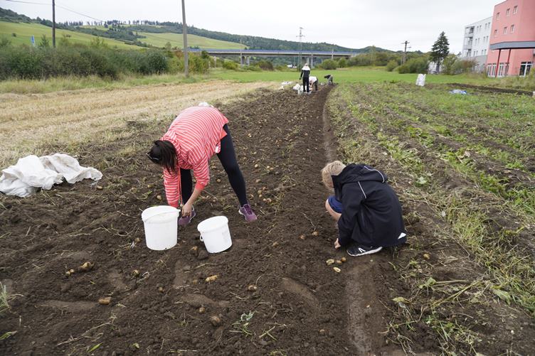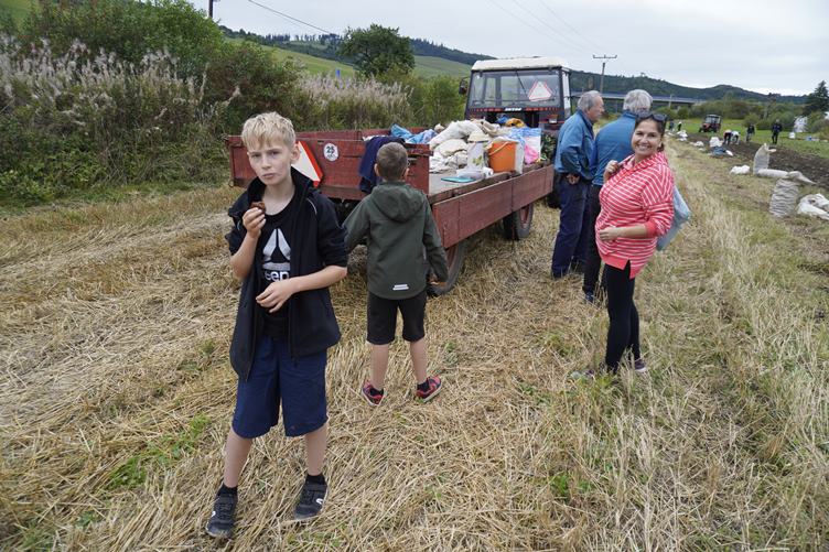 Doobeda sme boli pomôcť zbierať zemiaky. Chlapci sa povozili na traktore. Večer sme mali placky z vykopaných zemiakov. Večer sme sa hrali.