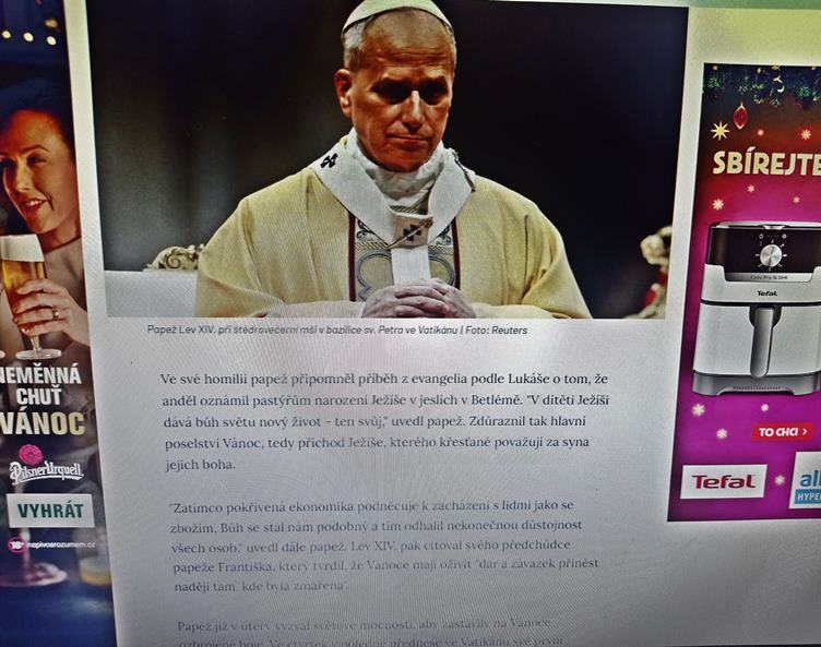 Ještě na poslední předštědrovečerní nákup. Nasmažil opravdu bezva řízky. A salát je prostě znamenitý. Odpoledne. Lucka je na Štědrý večer v Bílovicích. A tak jsme v kuchyni u večeře jen s Honzíkem. Doufám, že letos rituál vyjde jako vždy :-) Jdeme rozbalovat dárky. Toto pivo je vánoční dárek od Lucky. Co nám říká papež? Já myslím, že tento mluví velmi moudře.