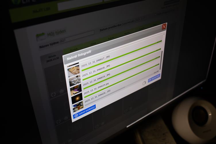 Napadl sníh a žluna si našla něco zajímavého pod ním. Nasnídám se a jedu na fyzioterapii. Po návratu je žluna stále tam, kde byla. Mám doma strašné sucho, takže přidávám odpařovač na topení. Pracuji na fotkách. Difuzér také dělá, co může. Dám si čaj.
