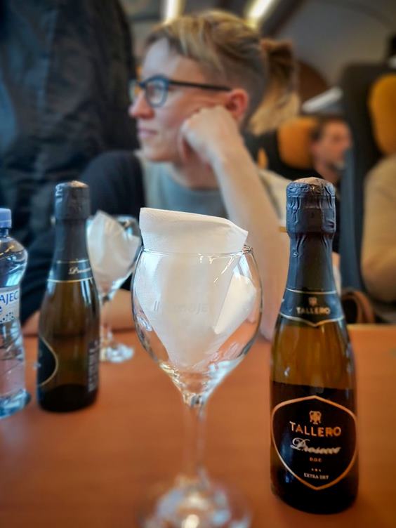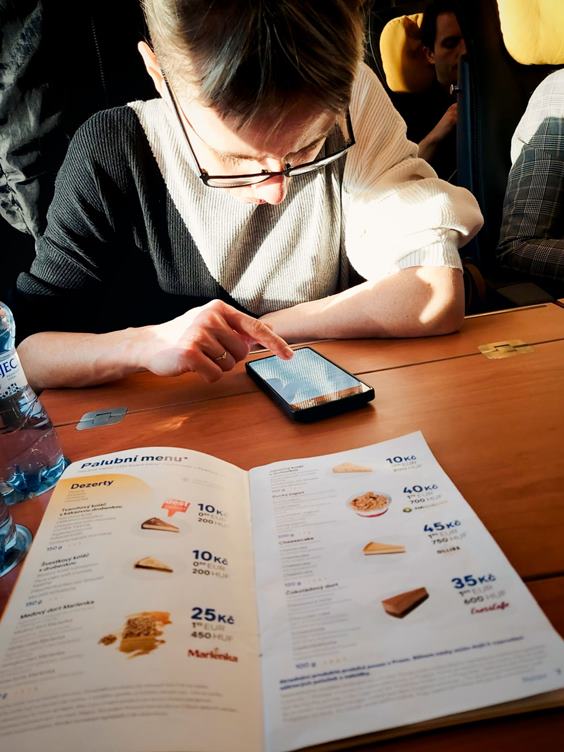 Pitný režim v tlumočnické kabině je sakramentsky důležitý. Markýruju tlumočení, aby mě kolegyně mohla vyfotit. Další nezbytnost je prostředek na hlasivky. Kytka v restauraci má evidentně málo světla. Cestou k nádraží ještě jedna fotka krásného Brna. My v Praze víme přesně, kolik je hodin - akorát že v Brně na nádraží. Ve vlaku - ceny jsou luxusní. Zdárný konec výpravy slavíme prosečkem a po dvou dnech se zase vidím se svým mužem.