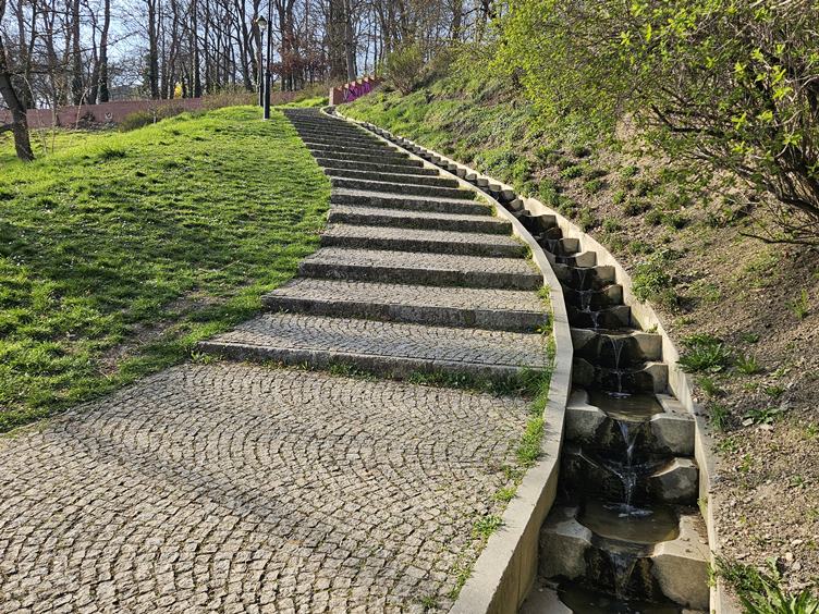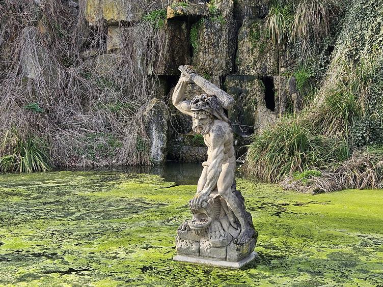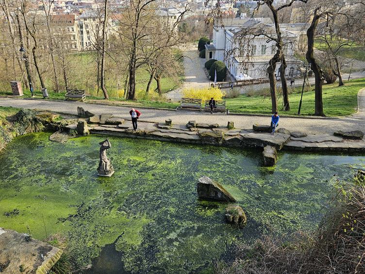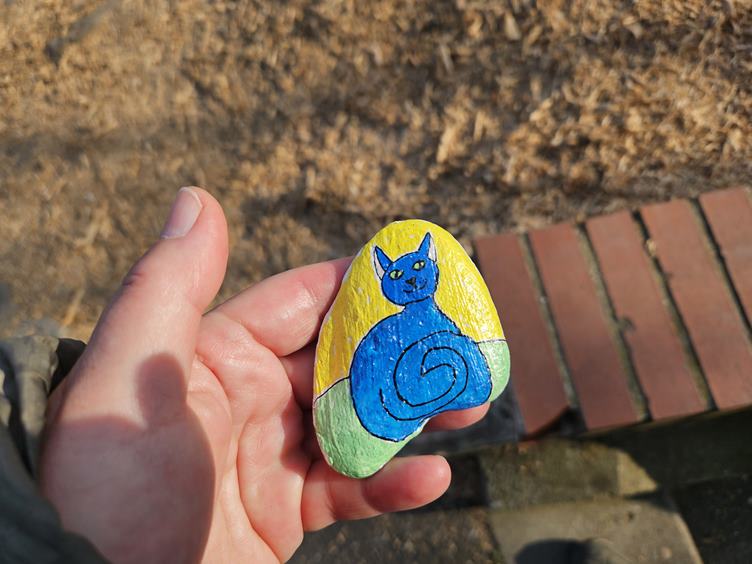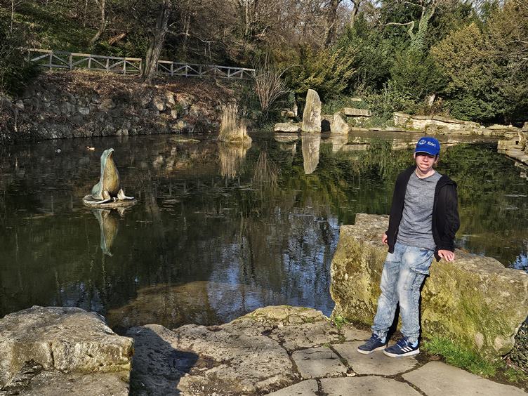 Úterý 24.3.2026 Stale rozkopaný park na Opatově. Po škole jdeme do zahrady Kinských. Je tu krásně. Tedy až na zelené jezírko a mraky miminek v kočárku. Našli jsme kámen s kočkou, doputoval sem z Moravy, jak jsem zjistila na Facebooku.