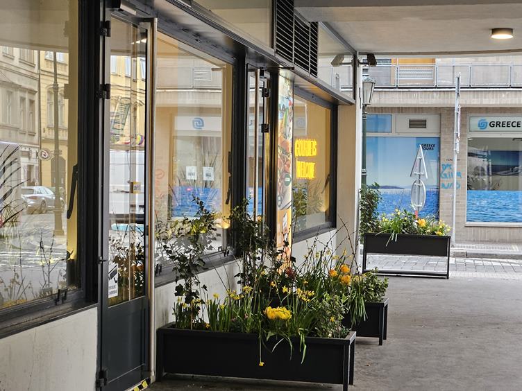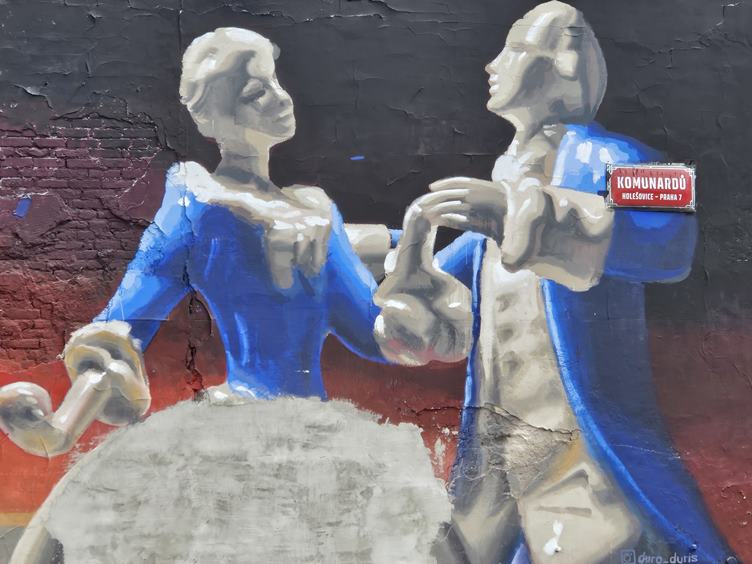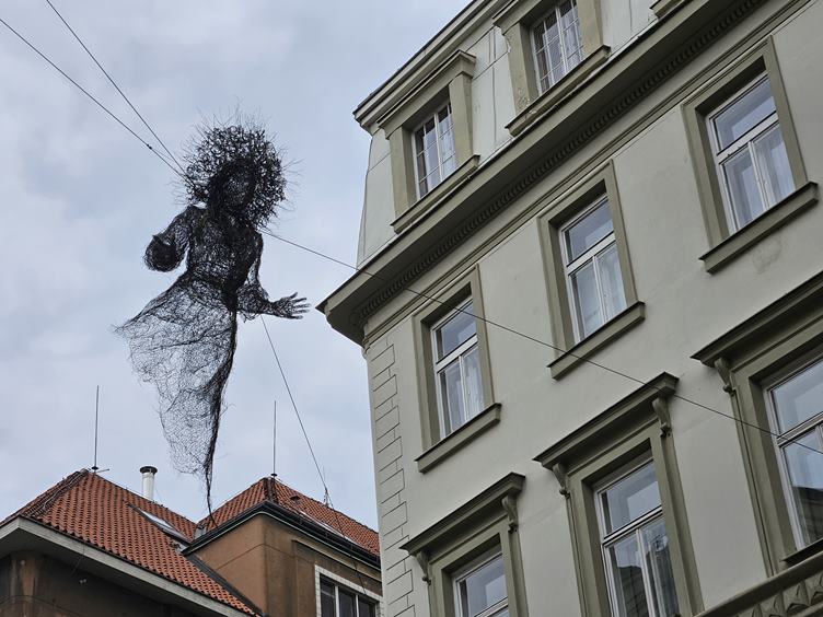 Pondělí 13.4.2026 Je čas vyrazit do práce. Tentokrát přes Dlouhou - místní bistro se pokouší zlepšit veřejný prostor květinami, ale je to trochu o zabití. Zavěšená socha Veroniky Psotkové. V práci se mění klimatizace a je to šílený randál. Odpoledne si fotím výlohy v Pařížské a pak malá procházka Holešovicemi. Super murál Porcelain. U matcha latté čekám na Bárta, který jede ze školy s Majdou a její maminkou.
