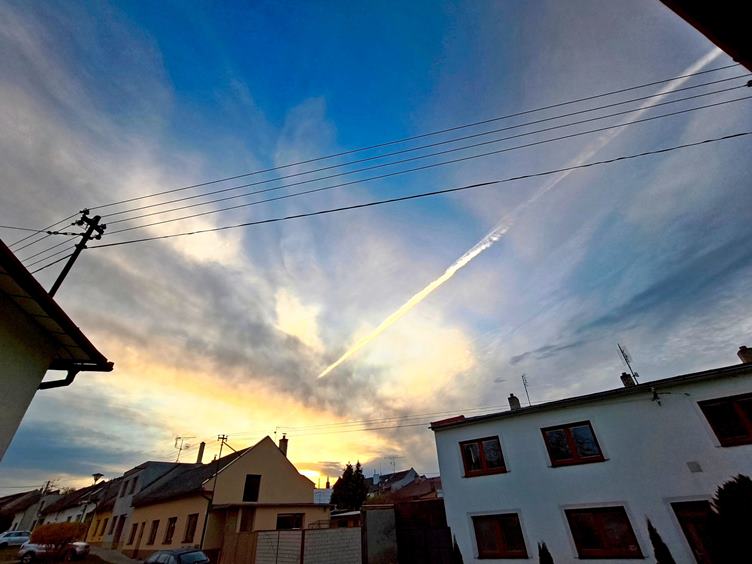 Souboj barevných kontrastů na obloze... Dnes odvoz směsného odpadu... Polínka do krbových kamen... Kytky u chodníku a jejich stíny vržené na chodník... Segedín... Dlužicha se má k světu... Večeře a opět trochu „vylepšená“ holešovská hvězdárna...
