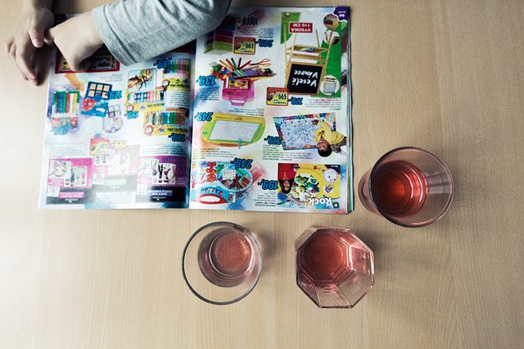 1) Snídaně až do gauče. 2) Dopoledne mám vzácnou chvilku klidu na čtení. 3) Oběd. 4) Lukášek si vybírá hračky z katalogu. Tohle by chtěl, tohle taky, tamto též a táto, nezapomeň, že i tohle a tohle. Asi si otevřu hračkárnu. 5) Uklidnit mne může snad už jen čokoláda se sušenkama. 6) A zpátky do boje. Mám početní převahu, ale ani to mi k výhře nepomůže. 7) Vláček také nesmí zahálet. 8) Žízeň je veliká, život nám utíká. 9) Letecká bitva na dobrou noc.