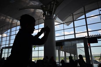 Brzy ráno ještě za tmy nasedáme do domluveného auta směr Medan ... V Medanu je mraky lidí, motorek a aut ... Jeden z motorkářů ... Letiště v Medanu je fungl nové ... Focení na letišti ... Připravujeme se na odlet ... Další fotograf kromě mě ... Let ze Sumatry pod rovník do Jakarty ... Letiště v Jakartě.